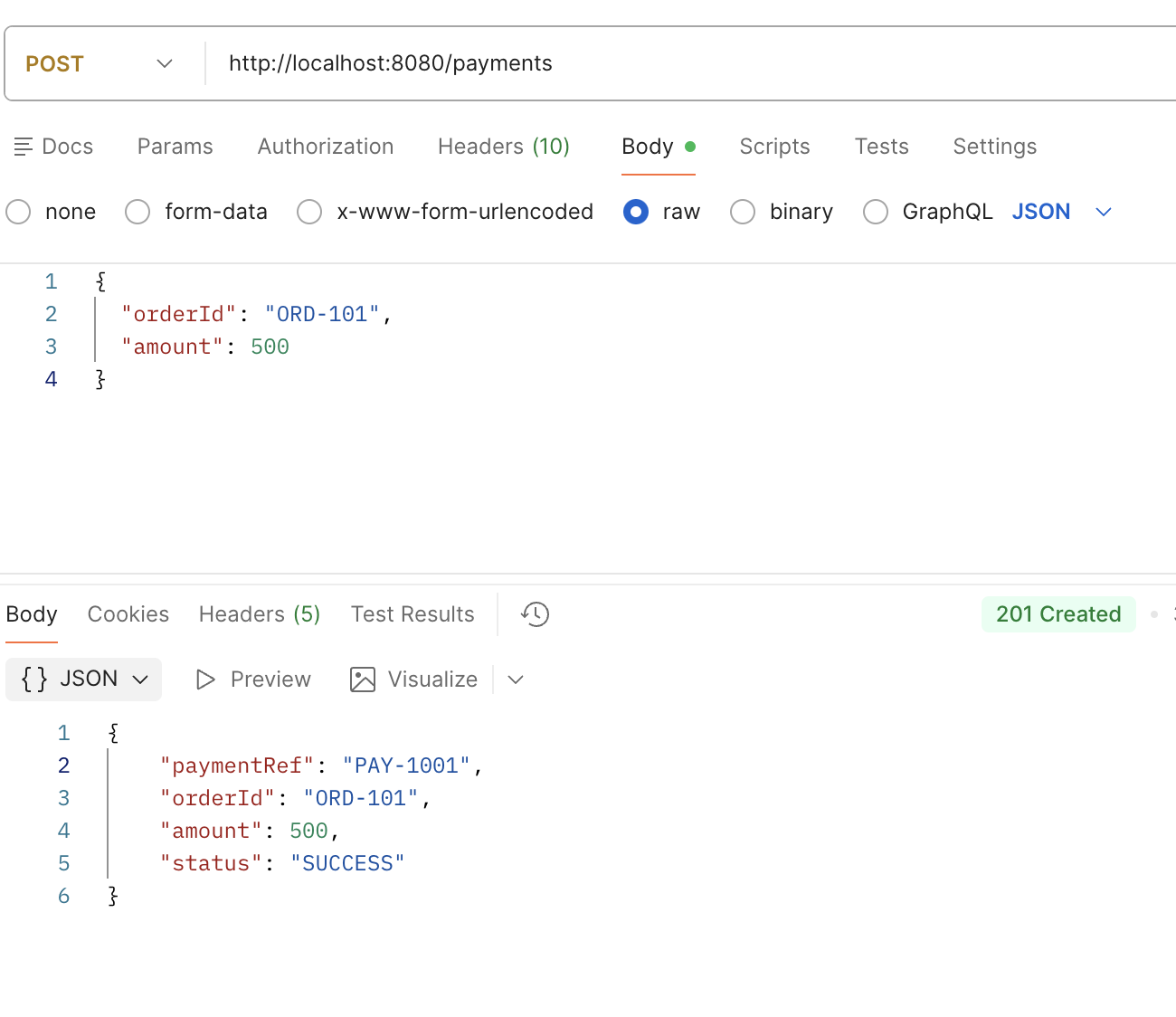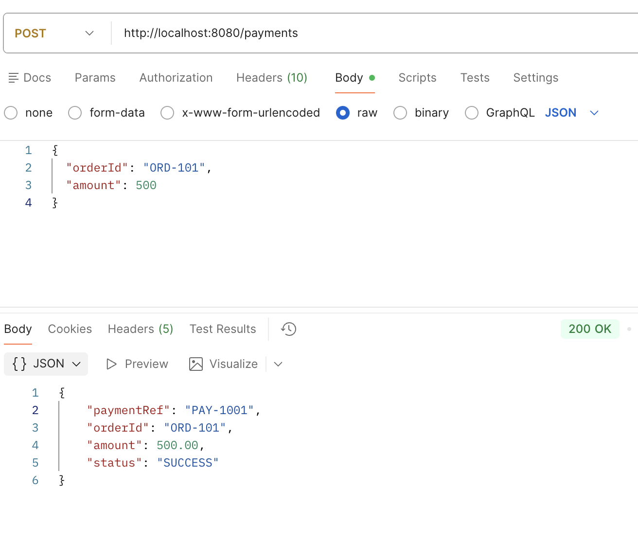 1 | PAY-1001 | ORD-101 | 500 | SUCCESS