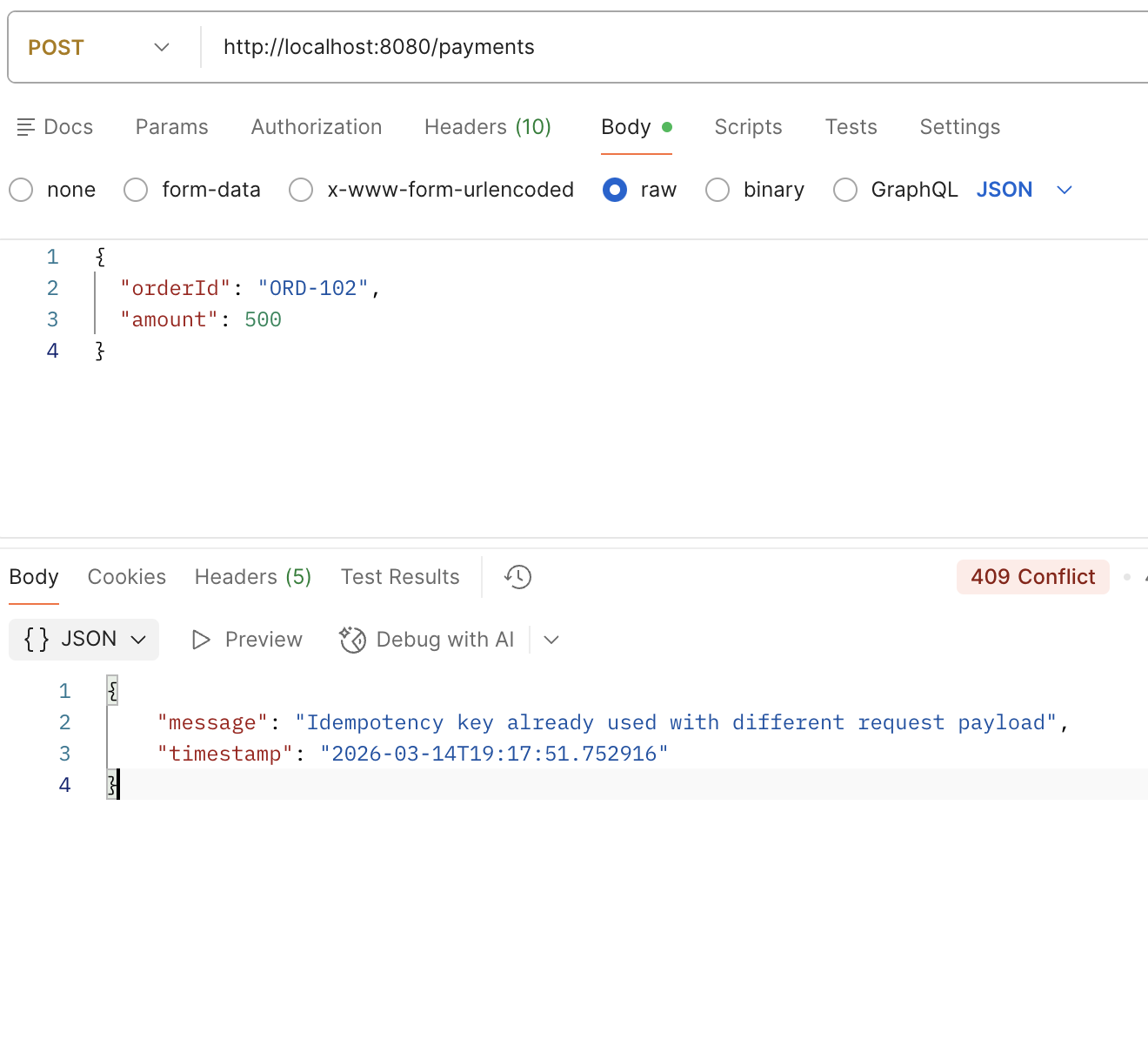 Note: Here, the request body(orderId) changed, due to which the previous and the current request hash does not match, for same idempotencyKey.