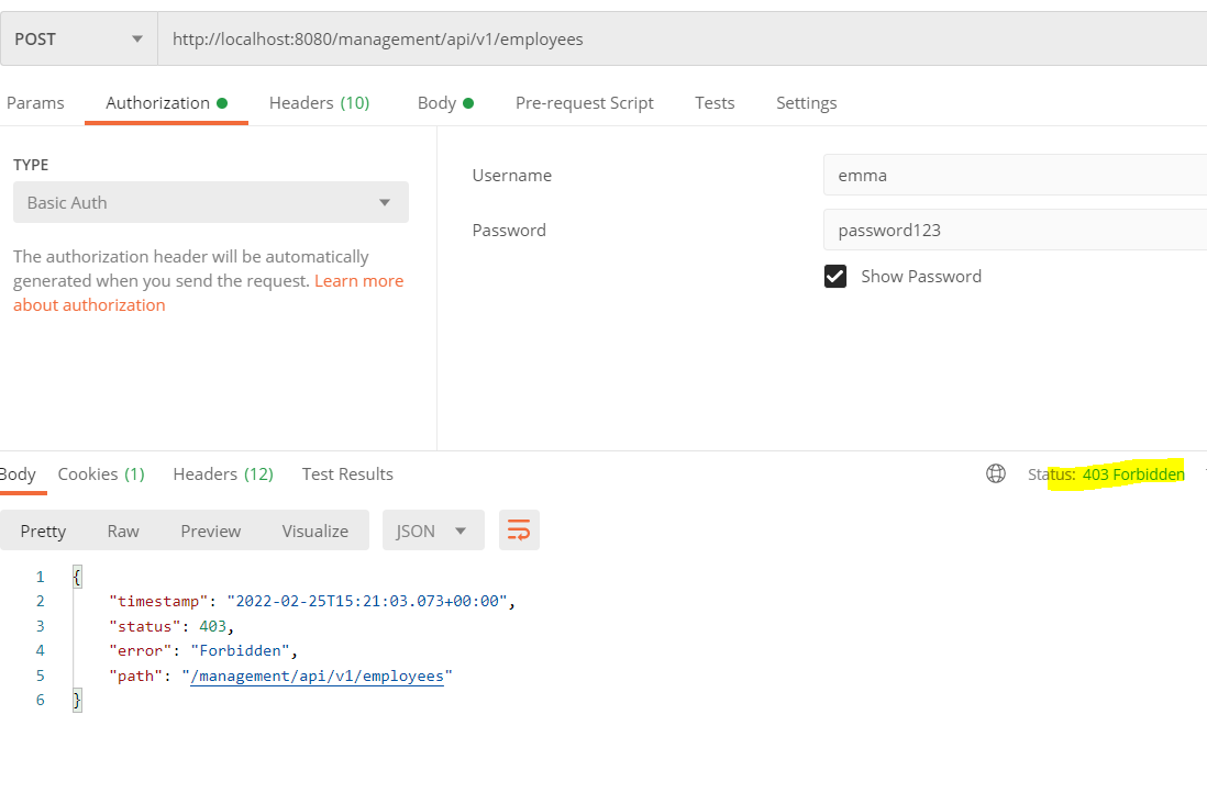 Since emmaUser is having role ADMIN and for ADMIN we have provided the required permissions, still we are not able to pass the security filter and we got 403 forbidden.