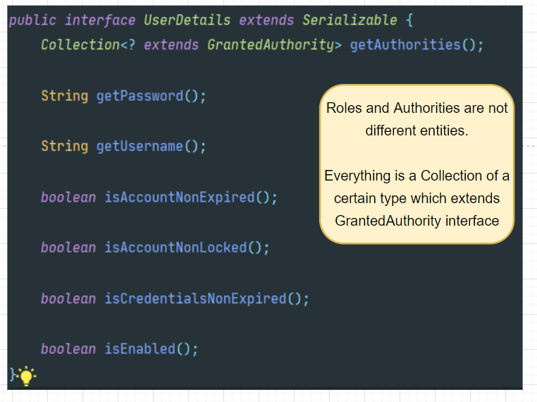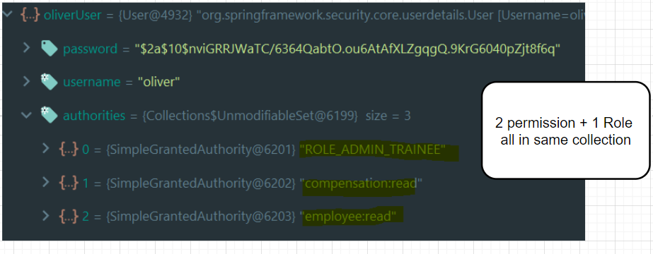 By the above 2 observations, we can say that Roles and Permissions/Authorities need to be present in a single Collection of type GrantedAuthority interface.