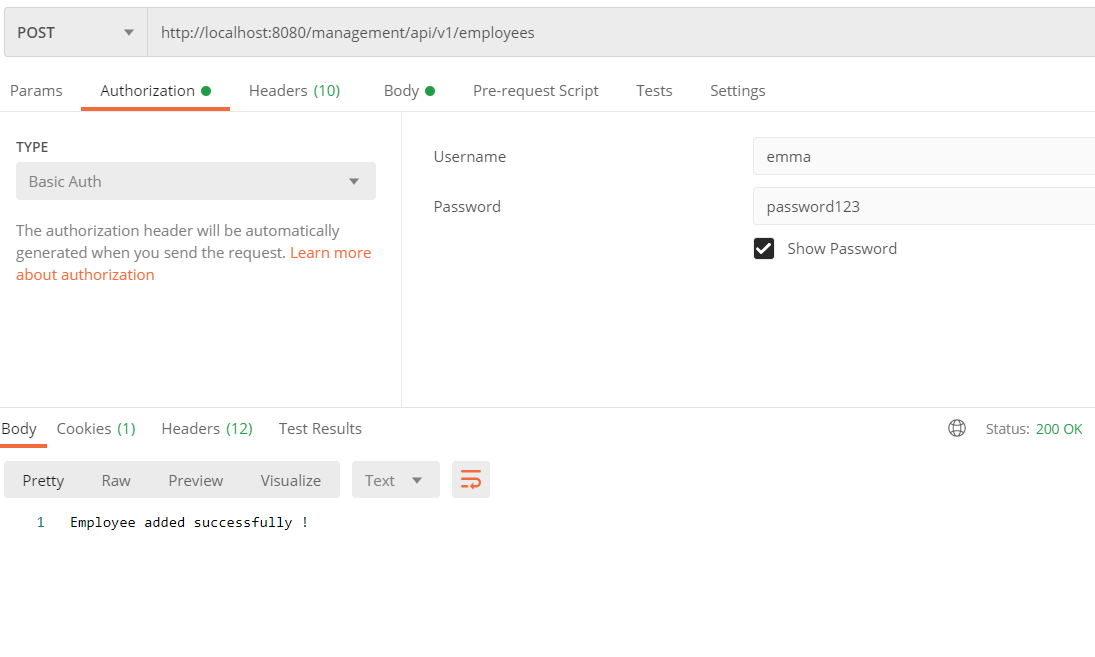 Apart from previous matchers, we have added 4 new antMatchers() which specify the http method types, pattern and the authorities of the users who can access the endpoints.