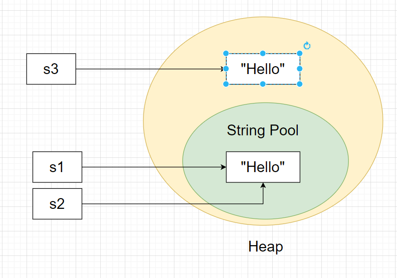 For s2, since "Hello" is already present in the pool, JVM will **not **create a new one, instead, it will return the earlier reference of string "Hello" which is s1.