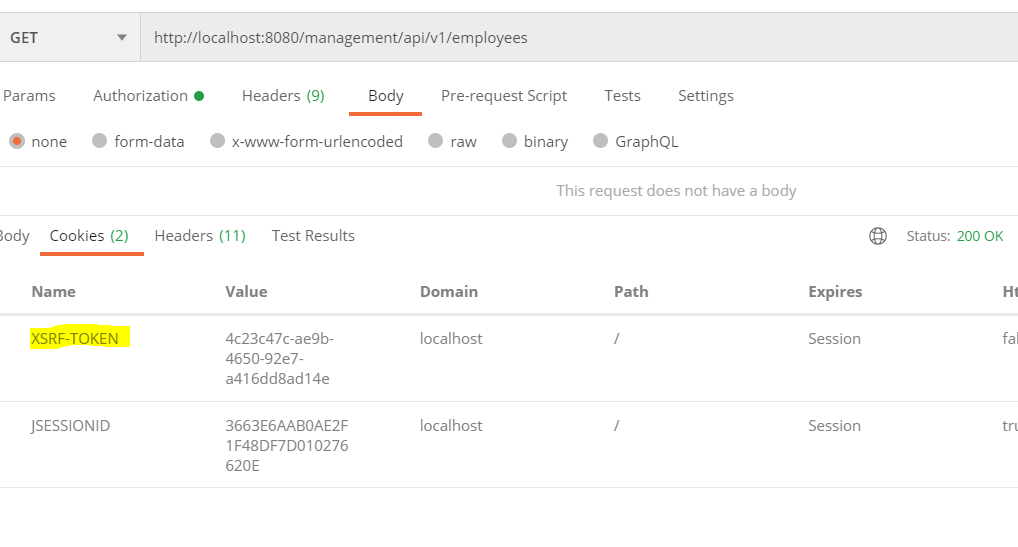 We will first hit the GET API and collect the token from the cookie(in regular practice we get the token with javascript eg- Angular or React).