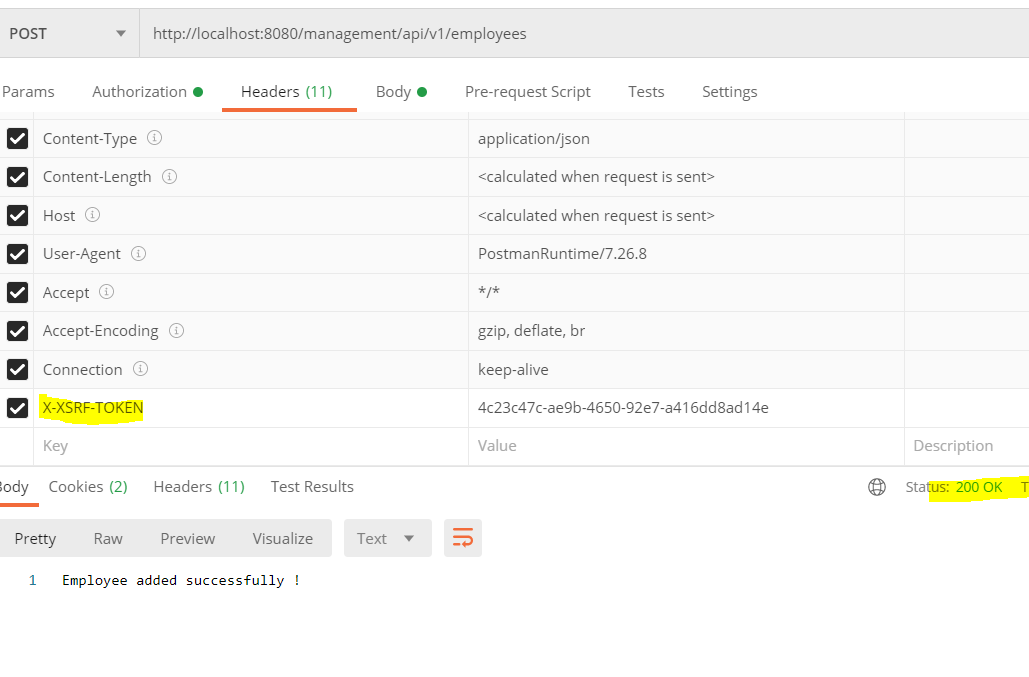 Spring security adds the token in the** cookie(XSRF-TOKEN)** and the client needs to send the same token with every request in the header(X-XSRF-TOKEN).